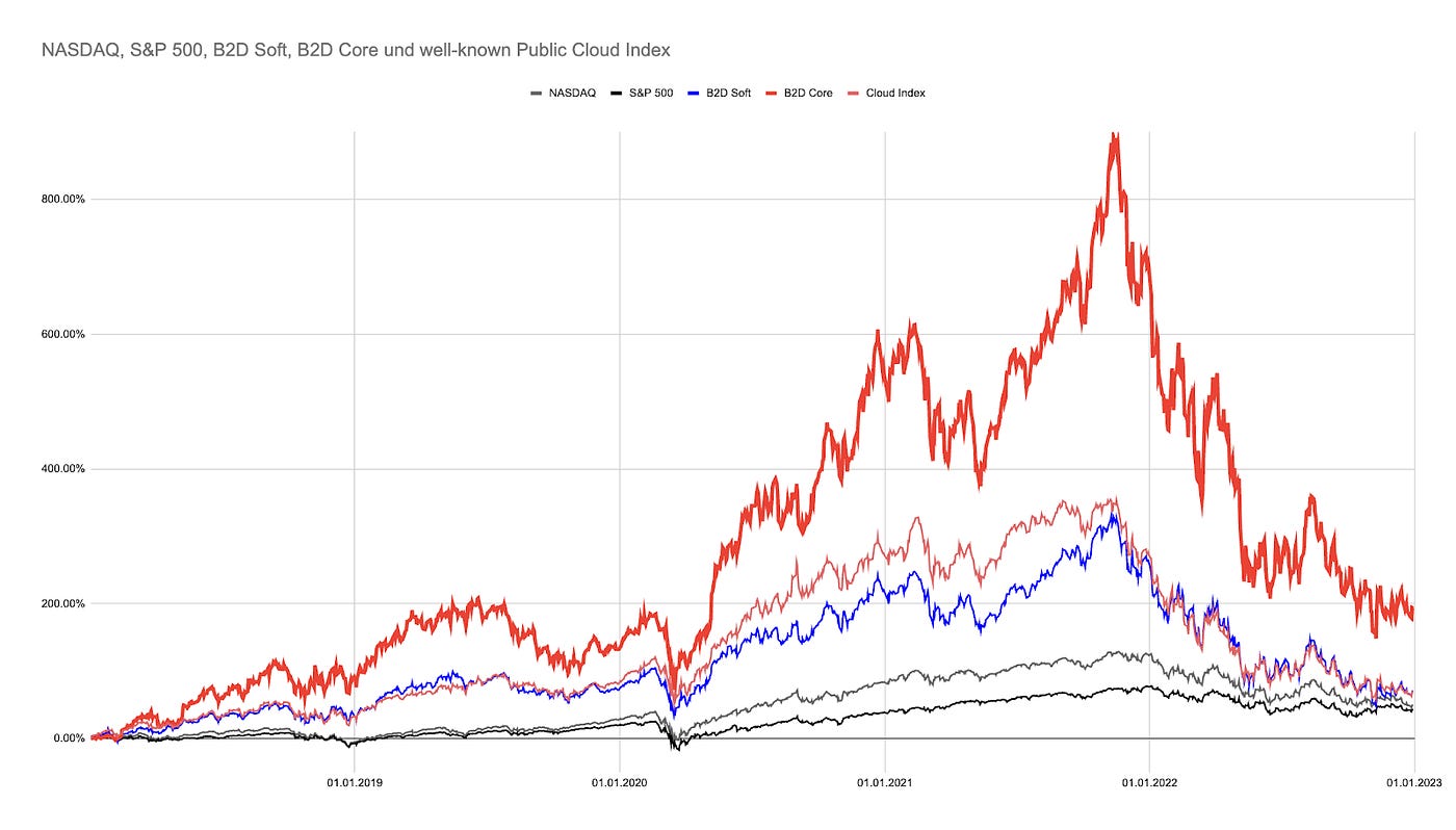 The pure B2D index on the other hand, clearly outperforms all other indices by significant margin. (Δ +150.83% to S&P 500, Δ +143.88% to NASDAQ, Δ +123.84% to Public Cloud Index)