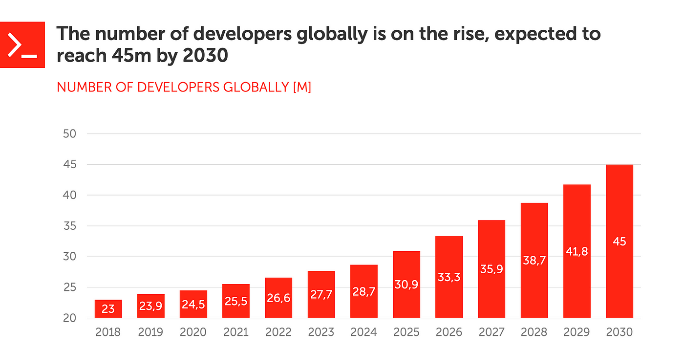 Generally speaking — a lot of macro tailwinds work in favor of this company category. First of all, the number of developers is growing rapidly, from >26m in 2022 to 45m by 2030.